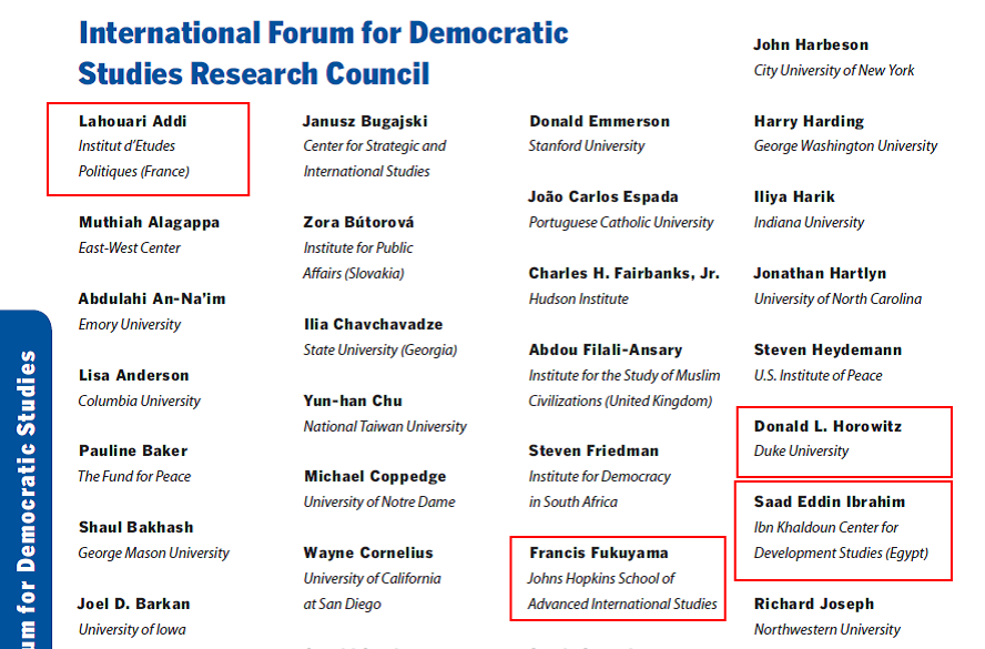 تضم قائمة مجلس البحث، إلى جانب عدي، أسماء مشاهير « الدمقرطة » الأمريكية. إذ نجد، على سبيل المثال، في التقرير السنوي ل2005 الصادر عن الصندوق الوطني للديمقراطية« NED » أسماء علماء سياسة مؤثرين في الساحة السياسية من بينهم فرانسيس فوكوياما و صامويل هانتنغتون و دونالد هوروويتز.